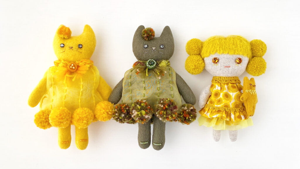 いろいろな道具を使って、毛糸のボンボンを作っています。作ったボンボンはドールの髪やフェルトネコのドレスに使ったりしています。