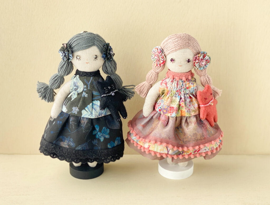 いろいろな道具を使って、毛糸のボンボンを作っています。作ったボンボンはドールの髪やフェルトネコのドレスに使ったりしています。
